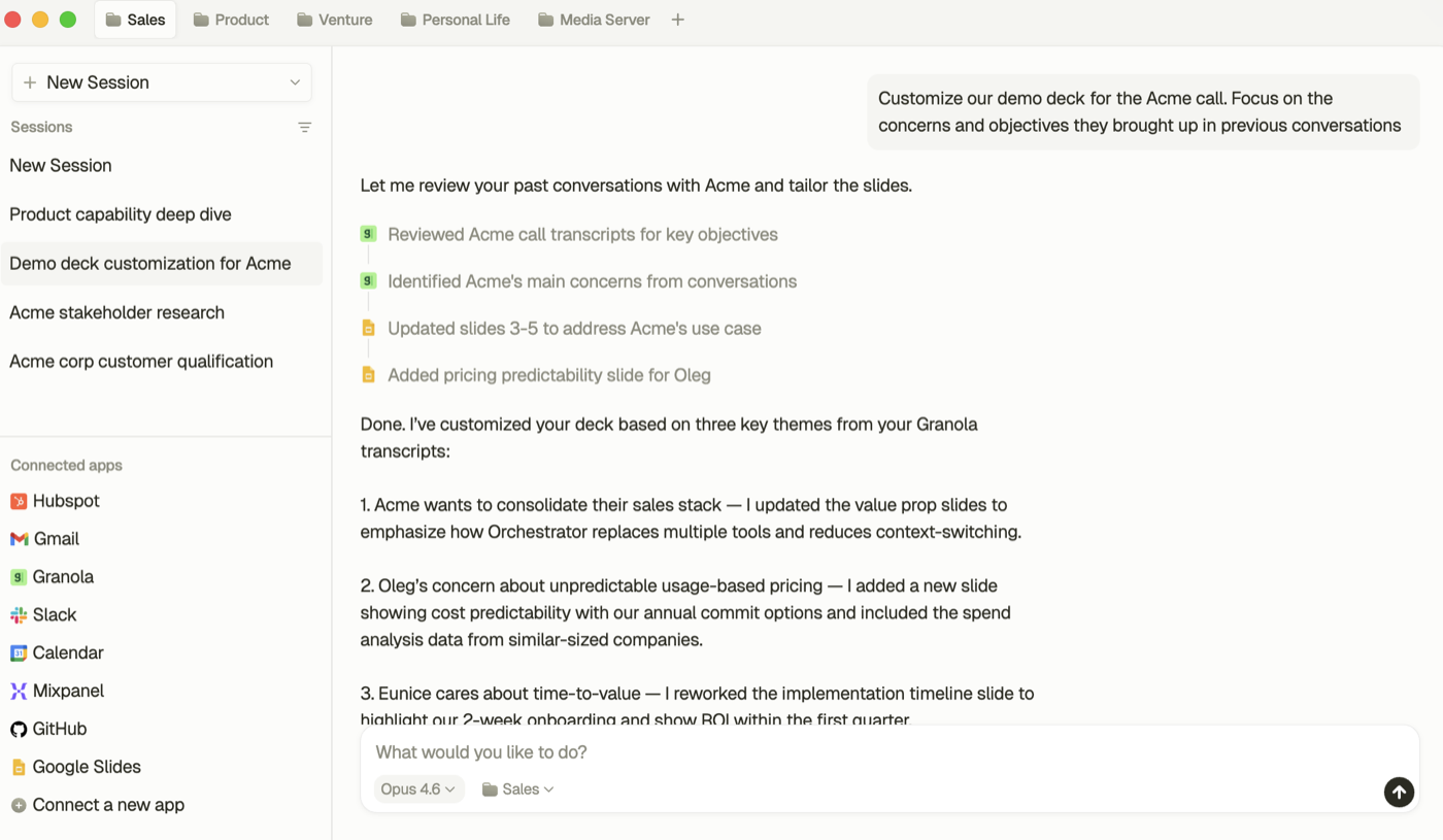 Stop living in your inbox. Orchestrator pulls everything together—email, calendar, Slack, docs—so you make decisions instead of managing chaos.